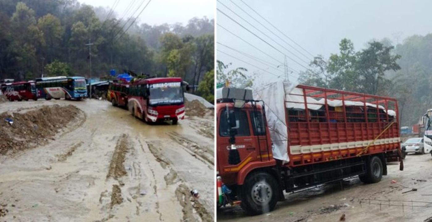 The road, under repair near 64 Modi at Daunne Bazaar, Ward No. 2 of Binayi Triveni Rural Municipality, became muddy and slippery from the rainfall, causing the highway to be obstructed.