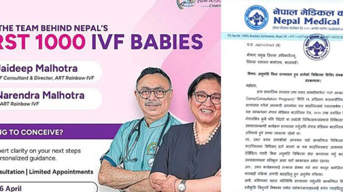The Nepal Medical Council has written to the administration to stop an IVF-related medical camp that is about to operate without proper authorization. The council has warned that running medical services without registration and prior approval violates the law and negatively impacts public health. The letter requests the authorities to immediately halt the program, initiate an investigation, and carry out legal action. April 15, Kathmandu.