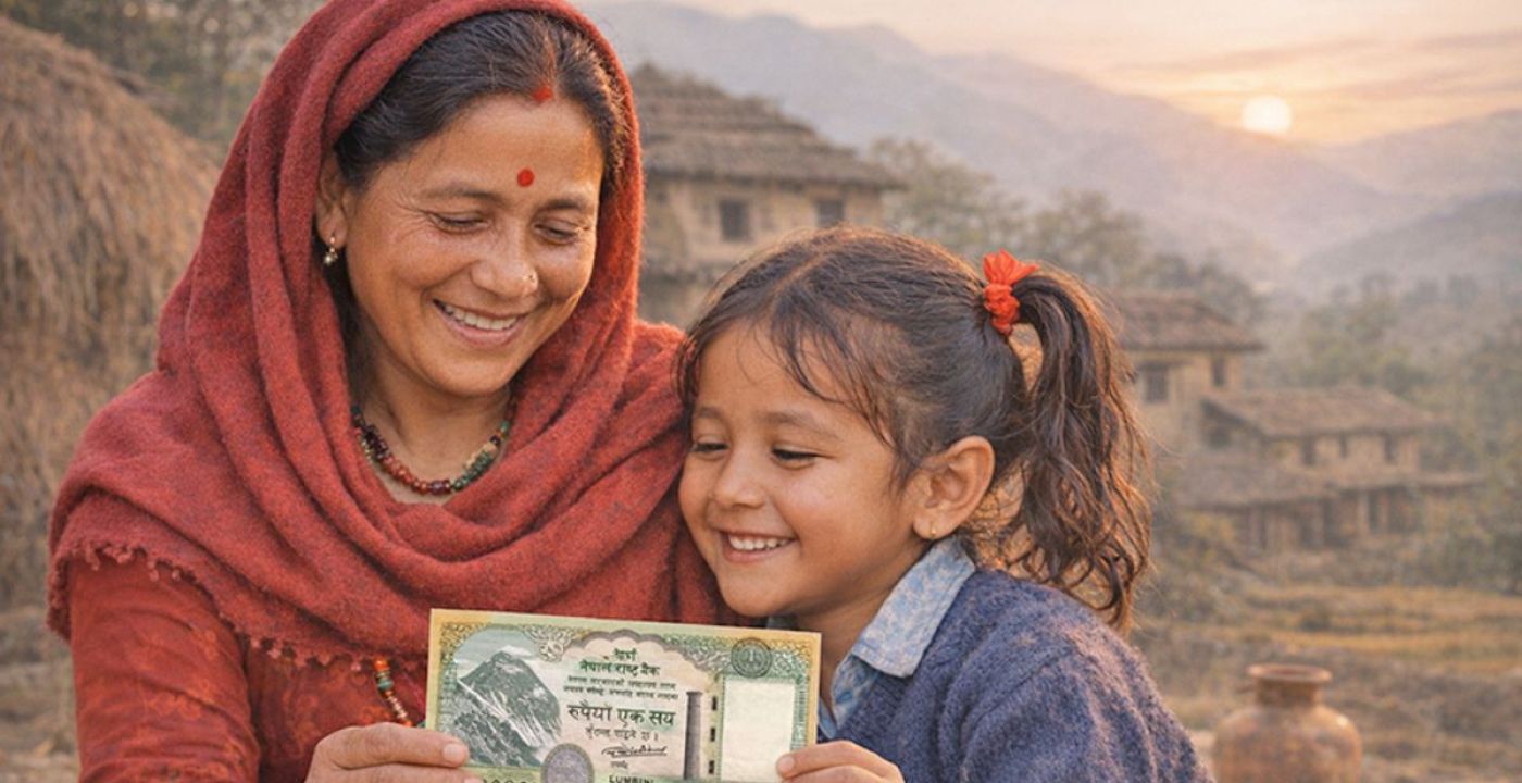 Though only 100 rupees from her mother, she has walked countless kilometers by foot until midnight many times over. She was never driven by thirst for water or the aroma of tea. Time and again, she journeyed empty-handed but survived. The note bears the guarantee of the Government of Nepal, stating: “If payment is requested, the Nepal Rastra Bank will immediately pay 100 rupees.” Against the backdrop of capitalist glitter, another innocent father and son will someday meet again. At parting, the son will receive the 100-rupee blessing given by his father, remaining unnamed in the backdrop—somewhere here among us, somewhere here among us.