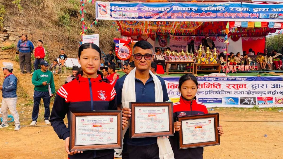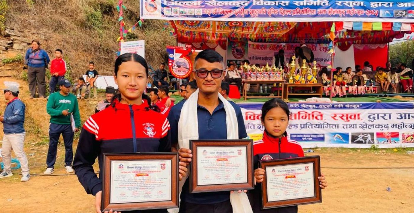 The Rasuwa District Sports Development Committee honored Dawa Tamang, a resident of Ward 1, Kalika Rural Municipality, and his two daughters, Diya and Diksha. Prabhat Tamang presented the awards at the closing ceremony of the 13th Rasuwa District Level Presidential Running Shield Sports Competition.