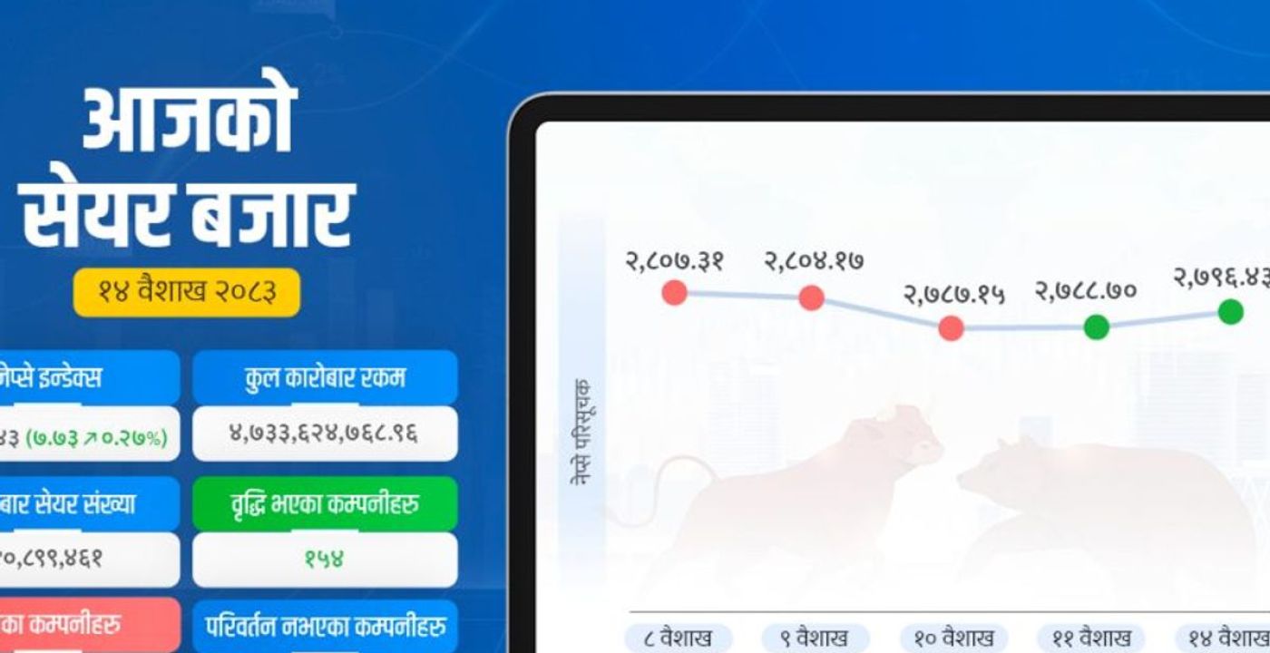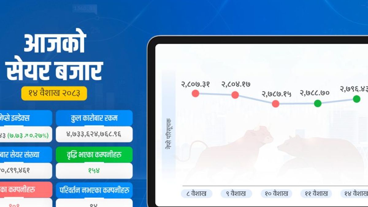 The NEPSE index rose by 7.73 points to reach 2796 on the first trading day of the week. Despite a decline in trading volume to NPR 474 crore, 157 companies experienced an increase in their share prices. Shares of Palpa Cement, Corporate Development Bank, Shikhar Power, and City Hotel surged by 15 percent. Kathmandu, 14 Baisakh.